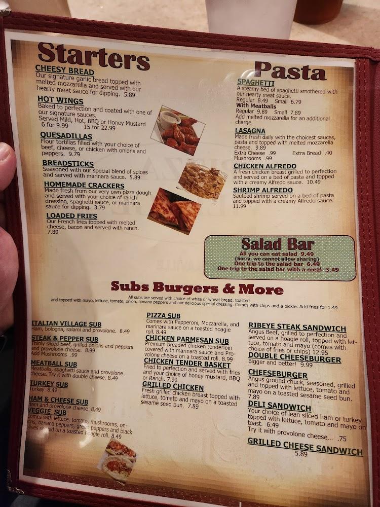 Pizza Village presents an extensive menu, perfect for any craving. Pizzas take center stage, with options ranging from classic types to specialty creations. Their spaghetti and lasagna offer hearty alternatives for pasta lovers. The salad bar stands out, providing fresh greens and toppings for a customizable meal.